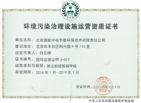 當(dāng)前位置: 國(guó)能中電公司動(dòng)態(tài)> 我司喜獲環(huán)保部《環(huán)境污染治理設(shè)施運(yùn)營(yíng)資質(zhì)甲級(jí)證書》
