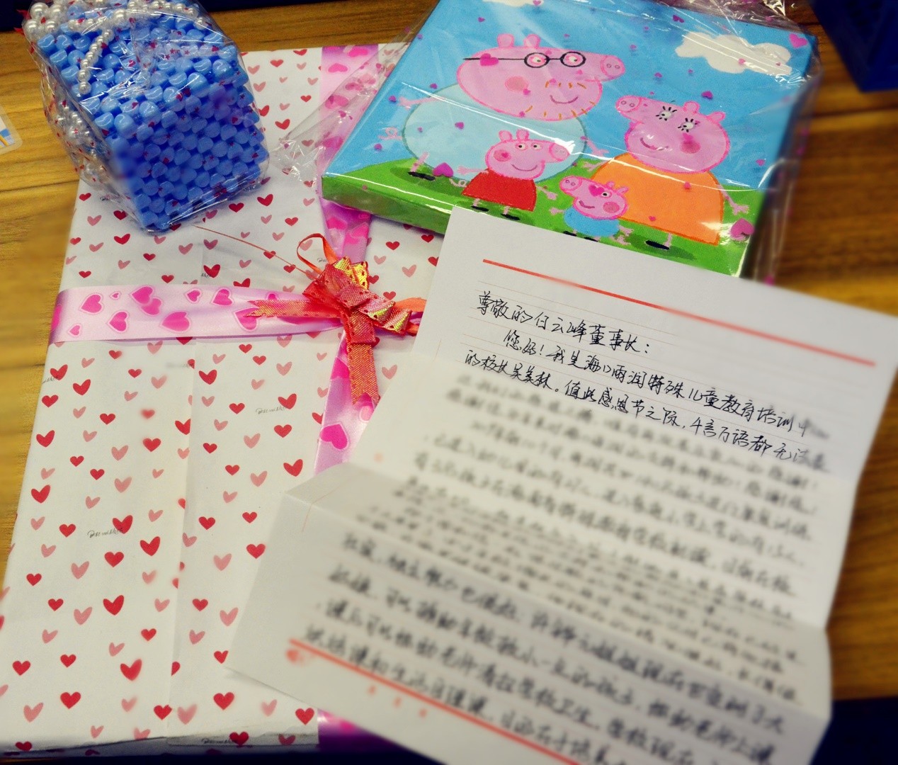 寫信的人是海口雨潤特殊兒童教育培訓中心校長吳美林,禮物則是由學校的自閉癥兒童及智力發育遲緩兒童親手制作,一同寄過來的還有一沓厚厚的照片,那是學校孩子們接受教育和康復訓練的活動掠影。